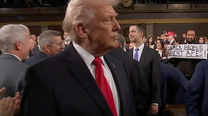 As Trump approached the podium to speak, Green held up a sign that read, “Black people aren’t apes!” in all capital letters.