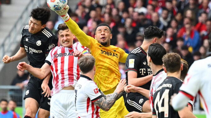 Freiburg’s German goalkeeper #01 Noah Atubolu makes a save during the German first division Bundesliga football match between SC Freiburg and FC Bayern Munich in Freiburg, southern Germany on April 4, 2026. (Photo by Silas STEIN / AFP) / DFL REGULATIONS PROHIBIT ANY USE OF PHOTOGRAPHS AS IMAGE SEQUENCES AND/OR QUASI-VIDEO