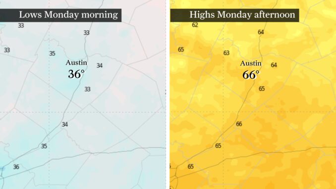 Austin temperatures dropped into the mid-30s early Monday morning, while towns north and west of the city — like Georgetown and Fredericksburg — fell to near and below freezing.