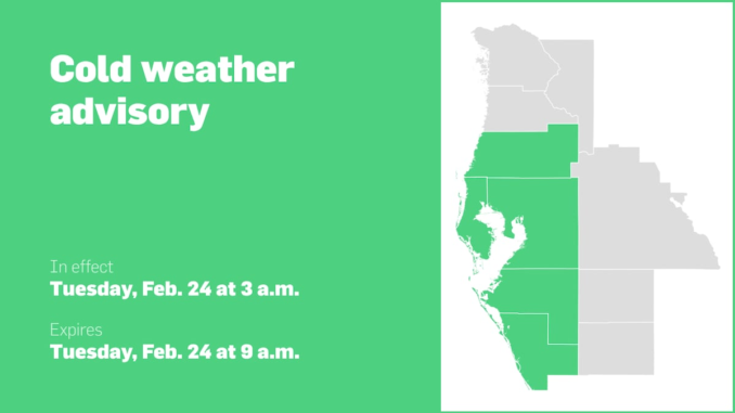 At 11:53 p.m. on Monday, the National Weather Service issued a cold weather advisory valid for Tuesday between 3 a.m. and 9 a.m. The advisory is for Pinellas, Pasco, Hillsborough, Manatee, Sarasota…