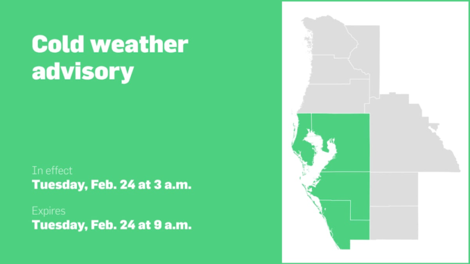 The National Weather Service released a cold weather advisory at 11:58 p.m. on Sunday valid for Tuesday between 3 a.m. and 9 a.m. The advisory is for Pinellas, Hillsborough, Manatee, Sarasota and…