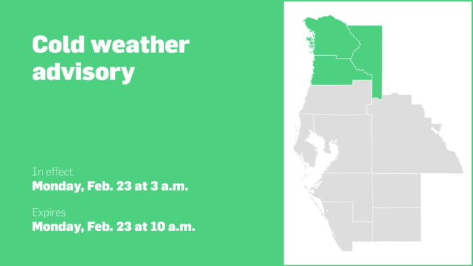 At 11:35 a.m. on Sunday, the National Weather Service released a cold weather advisory valid for Monday between 3 a.m. and 10 a.m. The advisory is for Coastal Levy and Inland Levy as well as Citrus…
