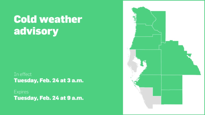 On Monday at 11:53 p.m. a cold weather advisory was issued by the National Weather Service valid for Tuesday between 3 a.m. and 9 a.m. The advisory is for Inland Levy as well as Polk, Citrus,…