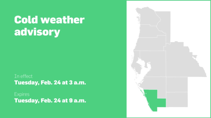 Cold weather advisory in place for Sarasota County for Tuesday – wind chills falling to 29 February 24, 2026 CNastvafrica Blog 0 The National Weather Service released a cold weather advisory at 11:53 p.m. on Monday valid for Tuesday between 3 a.m. and 9 a.m. for Sarasota County. Source link Related