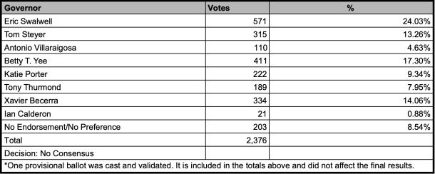 “Our threshold for endorsement is 60%. It’s unlikely we’ll get to an endorsement,” said party chair Rusty Hicks from the convention floor. He was right. No candidate came close. Preliminary delegate preference results showed U.S. Rep. Eric Swalwell leading with roughly 24% support, followed by former State Controller Betty Yee and former U.S. Attorney General Xavier Becerra.