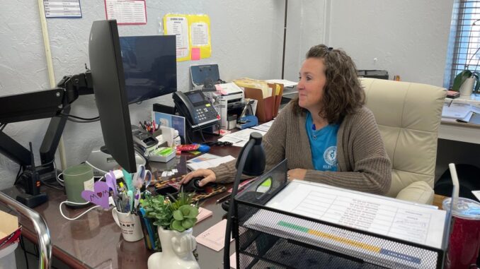 Temi Nichols, the Eastland County elections administrator, looks up the county’s voter turnout in her office at the Eastland County Courthouse on Feb. 23, 2026. Natalia Contreras/Votebeat