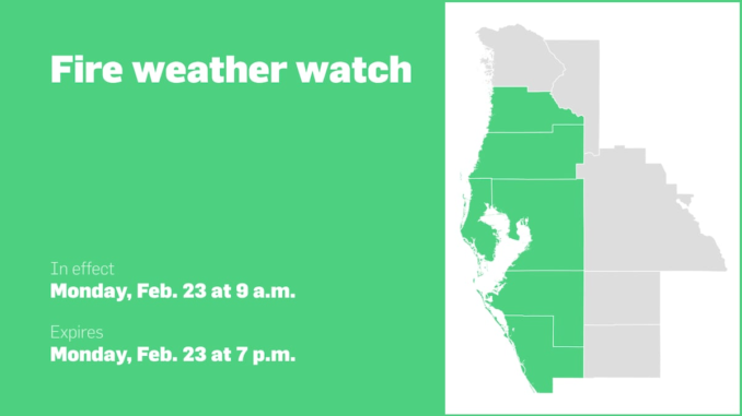 Fire weather watch for Central West Florida for Monday – gusts up to 30 mph February 23, 2026 CNastvafrica Blog 0 A fire weather watch was released by the National Weather Service on Sunday at 11:38 p.m. valid for Monday between 9 a.m. and 7 p.m. The watch is for Pinellas, Hernando, Pasco, Hillsborough,… Source link Related