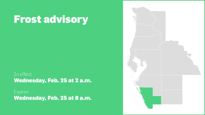 On Monday at 11:53 p.m. a frost advisory was released by the National Weather Service valid for Wednesday between 2 a.m. and 8 a.m. for Sarasota County.