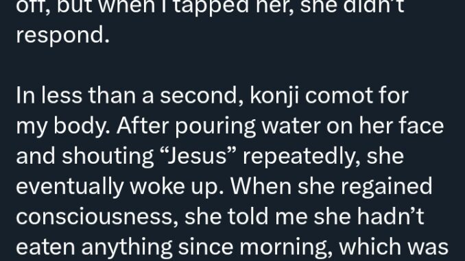 “In less than a second, konji comot for my body,” he wrote, describing how fear replaced excitement.