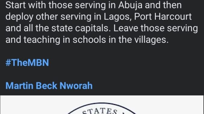 “Start with those serving in Abuja and then deploy other serving in Lagos, Port Harcourt and all the state capitals. Leave those serving and teaching in schools in the villages”, The post reads in part.