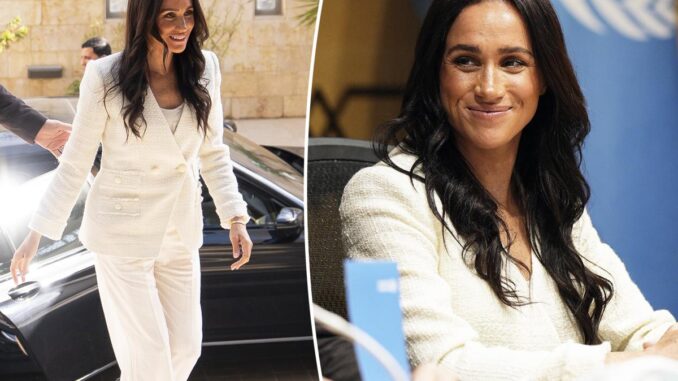 The Duchess of Sussex, 44, arrived in Amman, Jordan, on Wednesday wearing a head-to-toe Veronica Beard look for the start of a surprise two-day humanitarian trip with husband Prince Harry.
