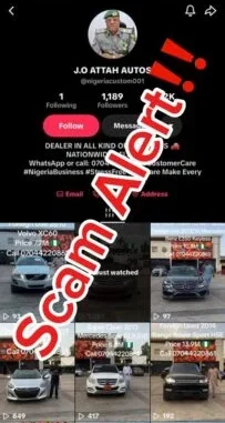 The Instagram page with the handle @nigeriacustoms001 features discounted pictures of vehicles with a phone number attached, targeting potential buyers unaware of the fraud.