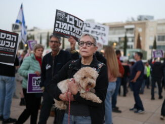 An Israeli left-wing demostrator holds a dog while taking part with others in a protest at HaBima Square in Tel Aviv on April 4, 2026, […]