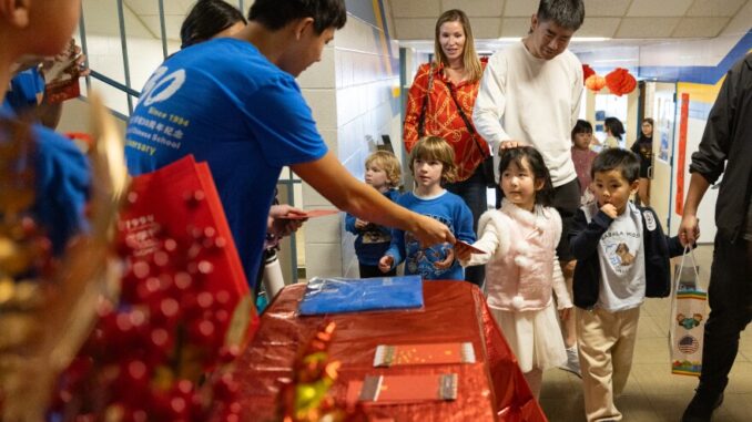 Amelia, 5, receives a lai see or red envelope from a staff member at a Lunar New Year festival event. Her father, Wen Sun, said, “This event is important for her to know her family culture.”