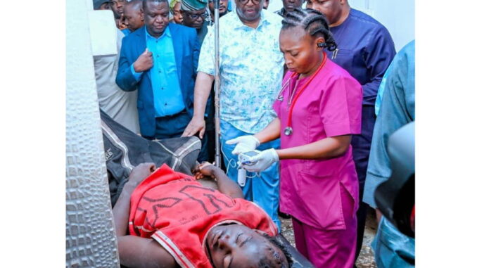 Plateau State Governor Caleb Mutfwang checks on injured victims receiving treatment at the Jos University Teaching Hospital.