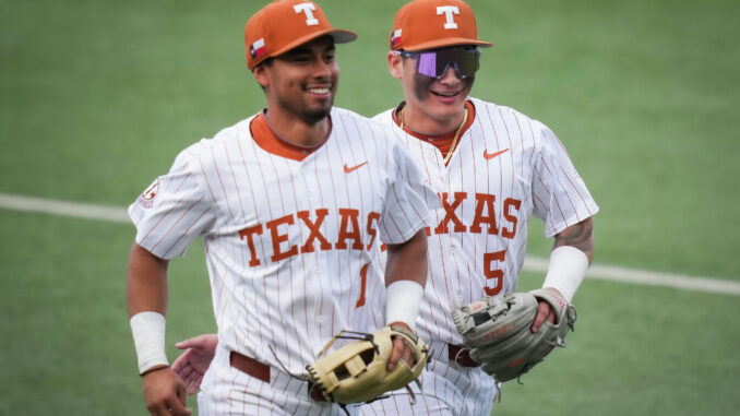 Texas is the first team on the scoreboard tonight. With two outs in the first inning’s bottom half, Aiden Robbins homered over the fence in right field to give UT a 1-0 lead.