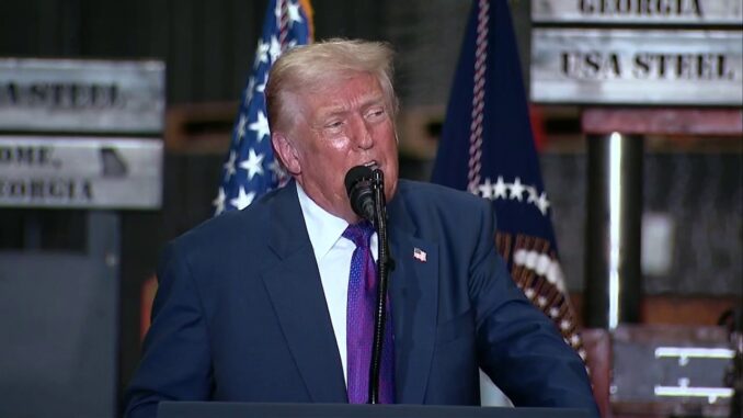Speaking to workers at Kusa Steel, Trump highlighted the impact of his administration’s 50% tariffs on foreign steel, which he said rescued companies from bankruptcy caused by subsidized products being “dumped” on the U.S. market.