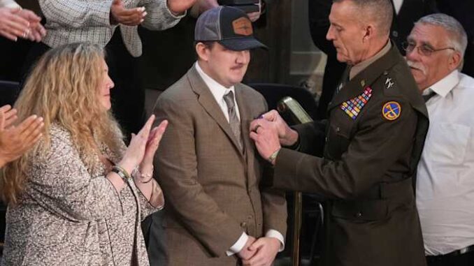 WASHINGTON – Air Force Staff Sgt. Andrew Wolfe, who survived a gunshot wound to the head while patrolling with the National Guard in Washington last year, was presented the Purple Heart medal during Trump’s State of the Union address on Tuesday.