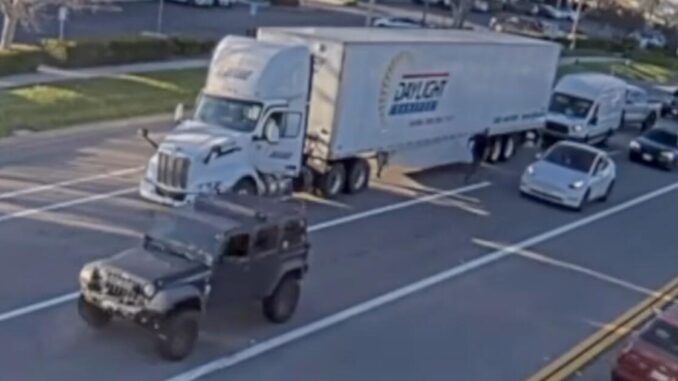 The video, shared by the Chino Police Department, shows two vehicles stopping at a red light in front of and behind a big rig on Friday. The car in front of the rig stops noticeably short of the intersection, and remains stationary even after the light changes, the video shows.