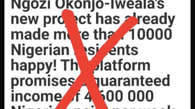 Okonjo-Iweala, a former Nigeria’s Minister of Finance said this on her social media handle while disowning a purported project attributed to her as ‘Ngozi-Iweala’s new project which has already made more than 10,000 Nigerians happy … promising 4600,000 Nigerian naira per week with minimum investment”.